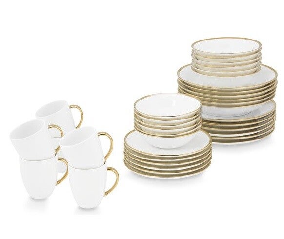 This beautiful and elegant 36-piece dinnerware set is available from the cabinet. This white dinnerware has beautiful gold accents. Thanks to the high-quality porcelain, the set is not only beautiful but also very durable. Your table setting will instantly have a chic look with this dinnerware set. This set can accommodate a total of 6 people.